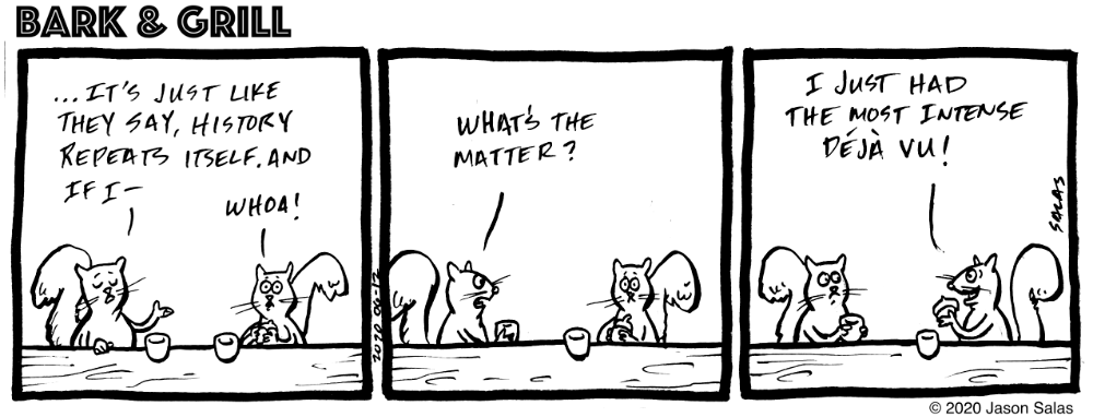 Think about it: we could be sitting at a pub, like the squirrels in the comic, and something occurs. Then, that same moment is replayed so that something changes ever so slightly, possibly nearby. Those sensitive to such a rift may notice it, albeit in a strange and inexplicable way.