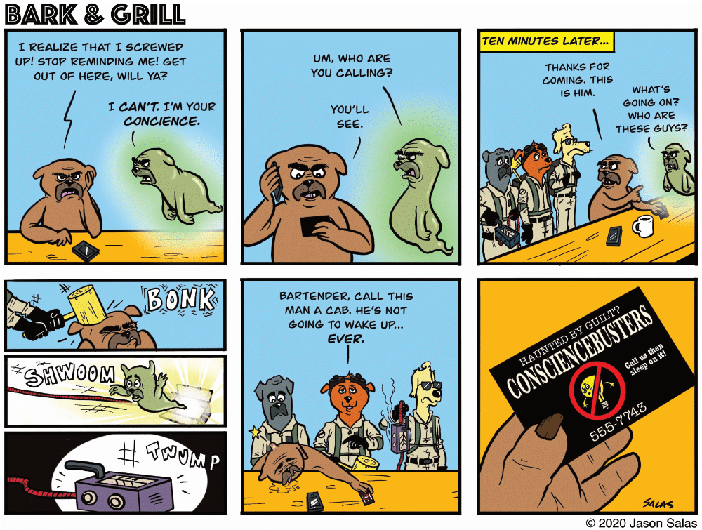 I wrote this gag while on a walk. I was thinking about “Eternal Sunshine of the Spotless Mind” and how the thoughts of stupid mistakes/actions from our past tend to haunt us. It wasn’t a far leap from haunting to “Ghostbusters.” So I mashed the two ideas together.