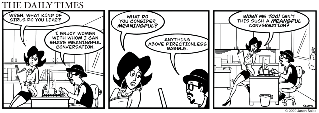“Meaningful” is subjective. A lot of it depends on one’s personality type. With that in mind, there’s nothing more frustrating than trying to have what you think is a meaningful conversation with someone whose idea of “meaningful” is not yours.