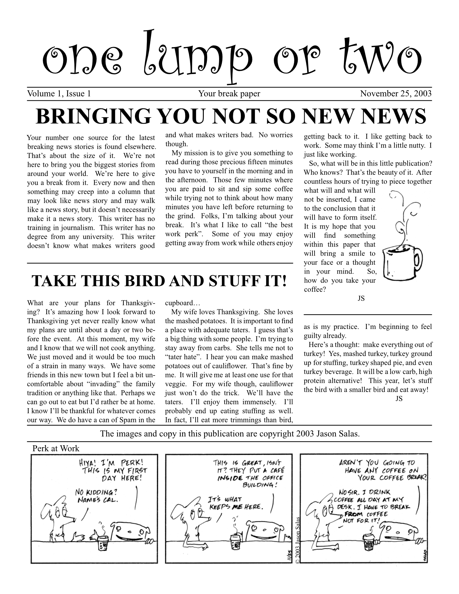 I still liked the name “One Lump or Two” so I created a little newsletter using that name with Perk@Work, as a featured comic. Here’s what it looked like: