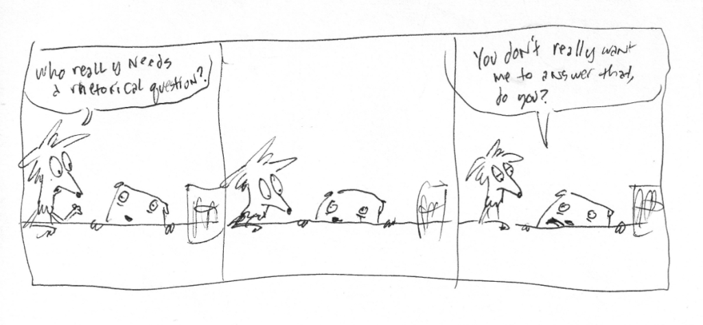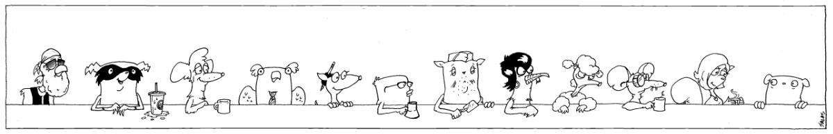 As you can see, it’s the same format: two dogs sitting up at a bar. The difference is that each comic used different “characters” (I place that in quotations since they weren’t characters, per se, but random dogs, cats, squirrels, etc.). In addition to the random critters, there was a random theme each strip. A lot of randomness, too much perhaps. I was rejected (once again). Still, I had a blast with it and maybe I’ll revisit from time to time. Who knows?