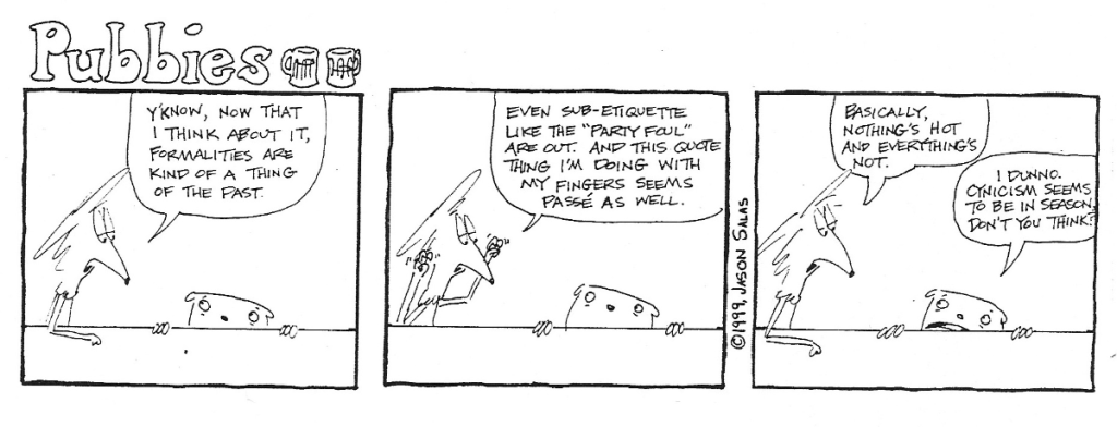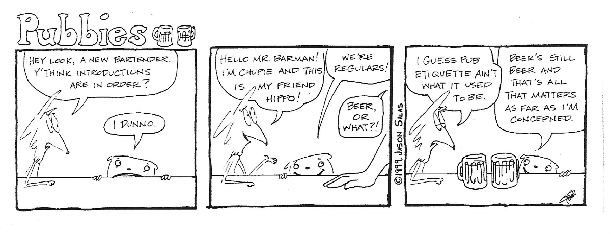 In 1999, I entered Pubbies into a contest in the college newspaper. The winning strip would be featured every week in their paper. I worked really hard (for a lazy person) to get the the following strips completed, even utilized a friend to help with the lettering. These are those strips: