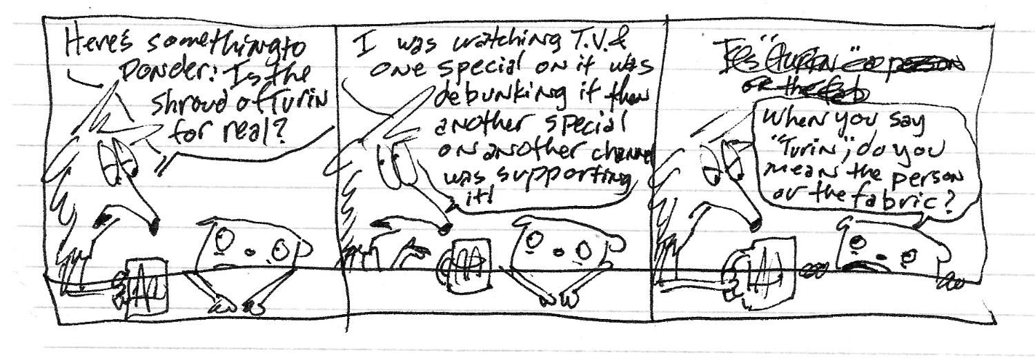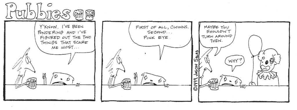 I had considered posting those old Pubbies comics online but they were so crude in both content and presentation. In fact, this post was originally meant as a public declaration of retirement of the Pubbies comic. However, when I read the original post to my wife and showed her those old comics, she laughed and said she liked them more than any of my other stuff. She urged me not to retire them.