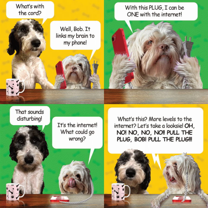 The dogs in his comic are J’s family members’ pets. How he got them to model so appropriately, I have no idea. In any case, when I saw it, I laughed out loud; not so much because of the gag, but because I did not expect real dogs! So creative!