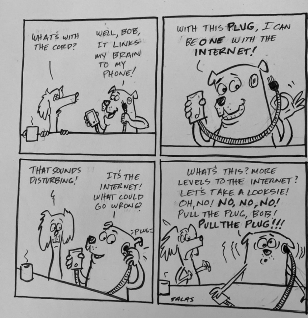 I drew the comic and thought it could use something more. J. is big on tech and gadgets and I thought he would like the subject matter. I sent him a pic of my quickly-drawn comic below: