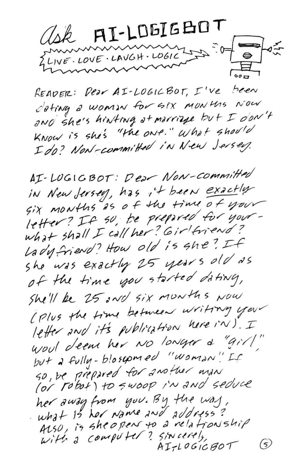 Has it been exactly six months as of the time of your letter? If so, be prepared for your – what shall I call her? “Girlfriend?” “Landy Friend?” How old is she? If she was exactly 25 years old as of the time you started dating, she’ll be 25 and six months now (plus the time between writing your letter and its publication herein). I would deem her no longer a “girl,” but a fully-blossomed “woman.” If so, be prepared for another man (or robot) to swoop in and seduce her away from you. By the way, what is her name and address? Also, is she open to a relationship with a computer?