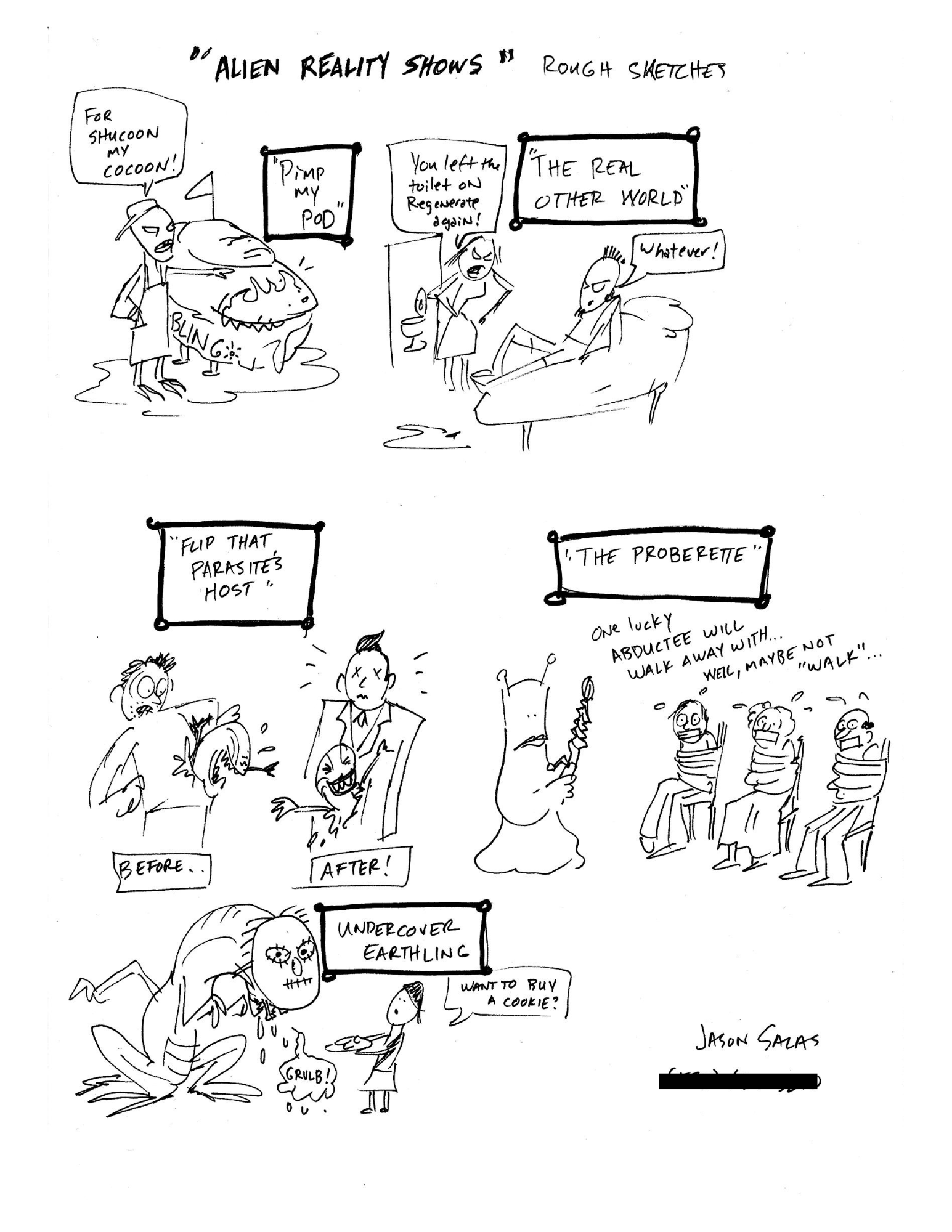 This is just like it sounds: reality shows with an alien twist. The attached rough sketch reflects a series of singe-panels (which may be rendered on different types of TV sets in various alien home environments). This idea could also be drawn out into a series of multi-panel strips.