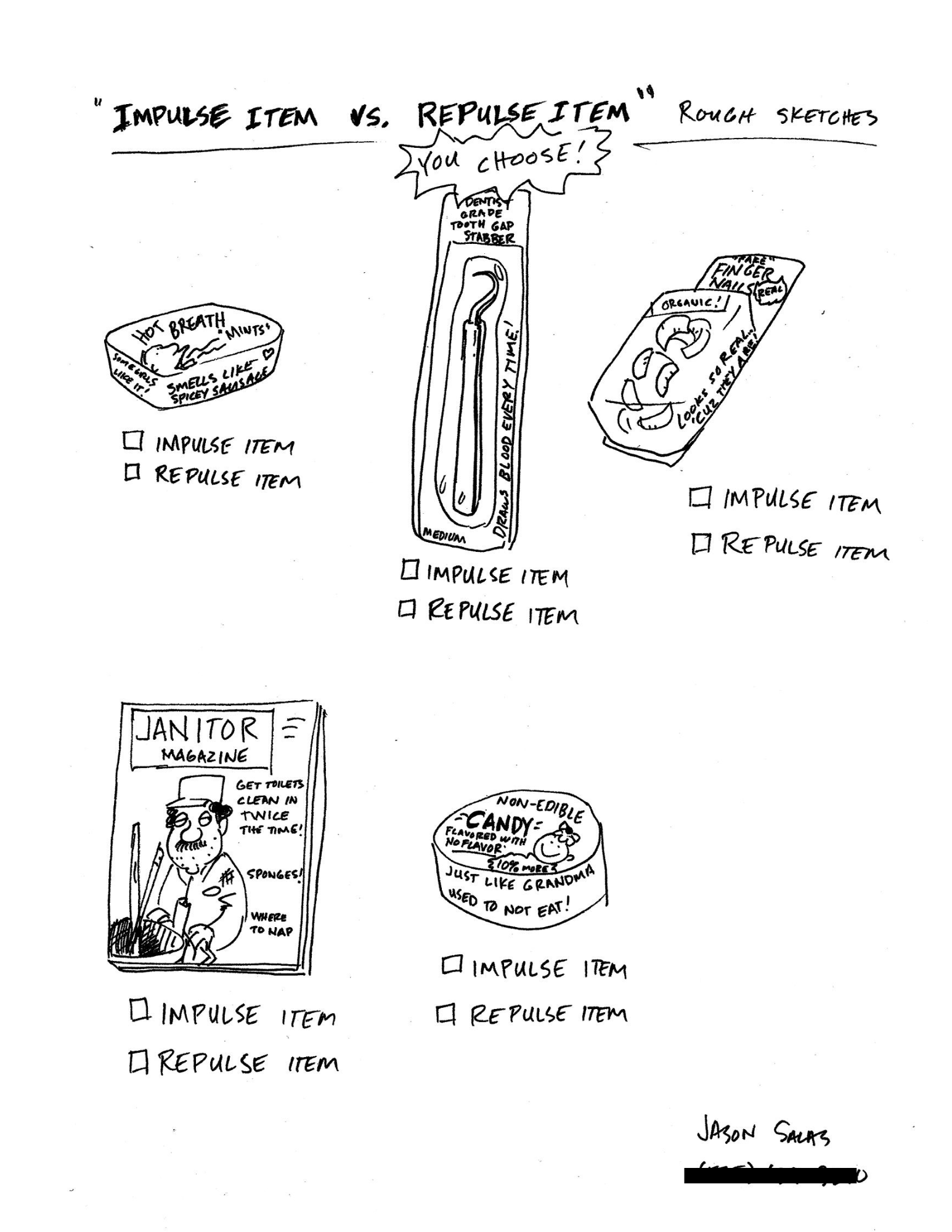 Possible lead-in: Who has not spent an extra $79.00 on impulse items at the grocery store check-out line? How do they pick such wonderful items that you never thought you needed until you were buying toilet paper at 11:45 pm on a random Tuesday night at the 24-hour superstore? Questionnaires such as this let manufacturers know if their items are desirable or undesirable. You choose!