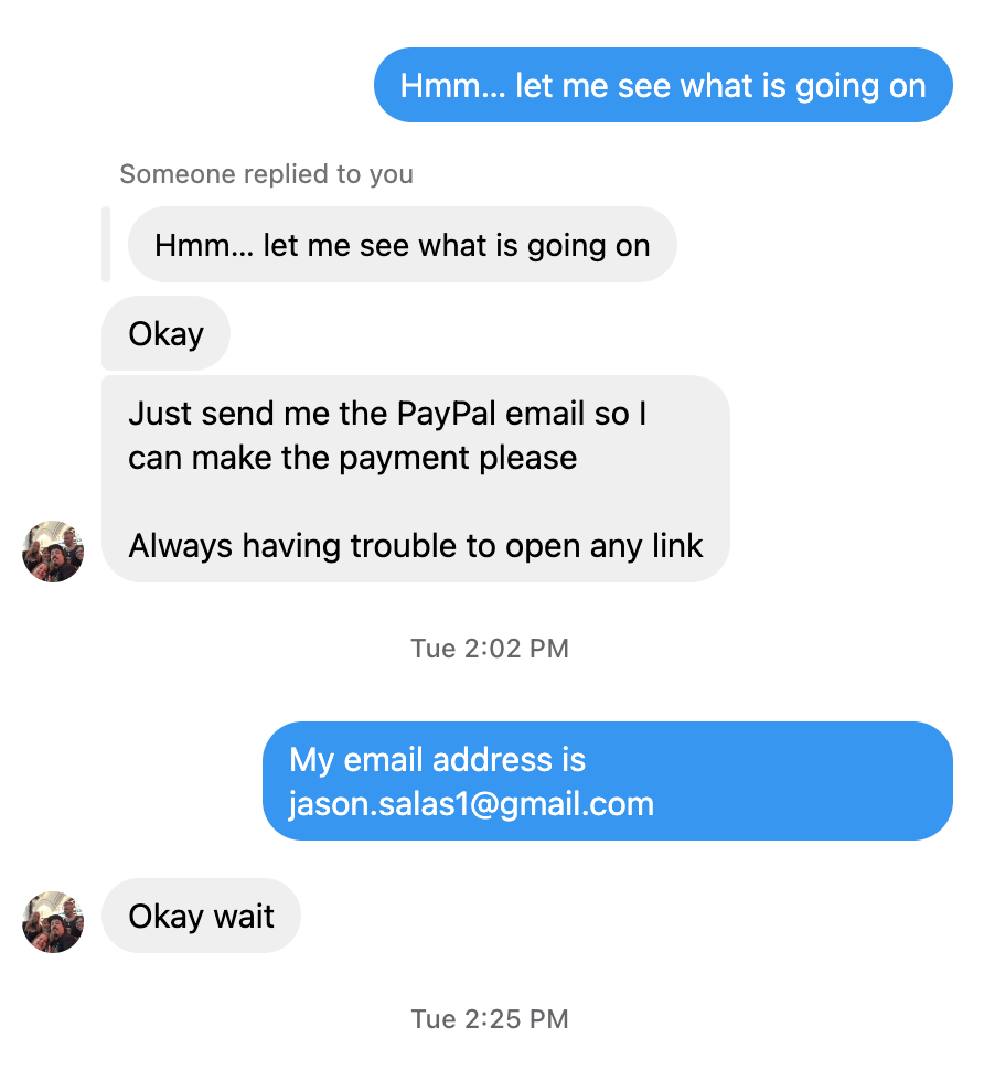 I told him to pay via Venmo or CashApp. He said he only uses PayPal; not my favorite but I have an account. So I sent him the link.