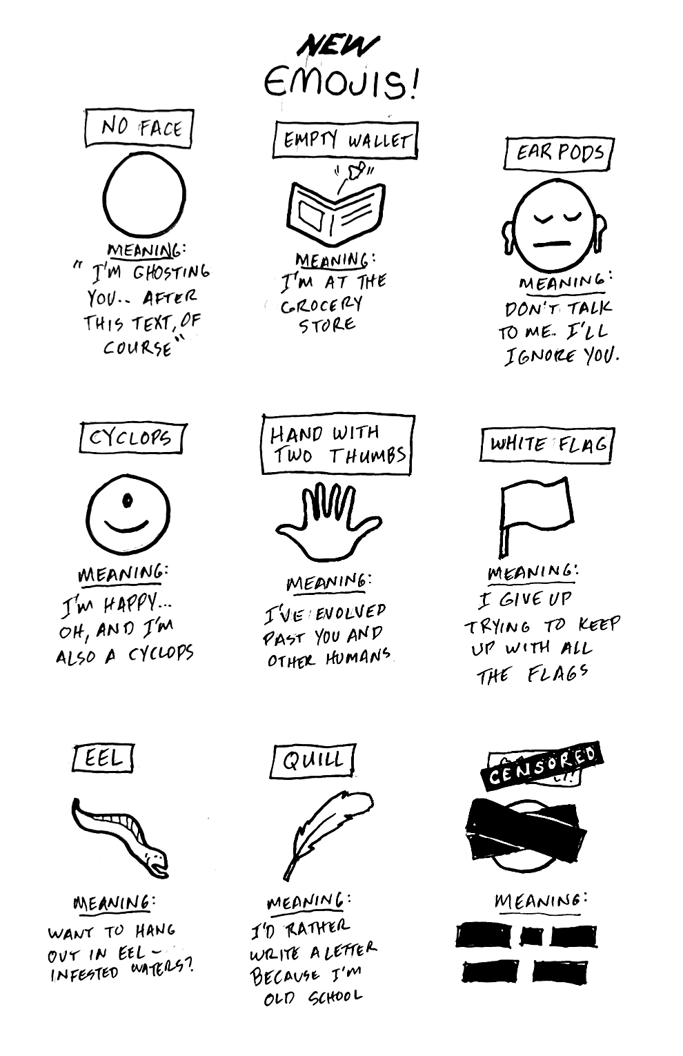 I bet some of these emojis exist already. But, then again, the nature of Oddballs is I write and draw the gag at the same time so there is very little research, if any. Sometimes I’ll reference a picture if I don’t know how something looks, but usually, I’m just tearing through.