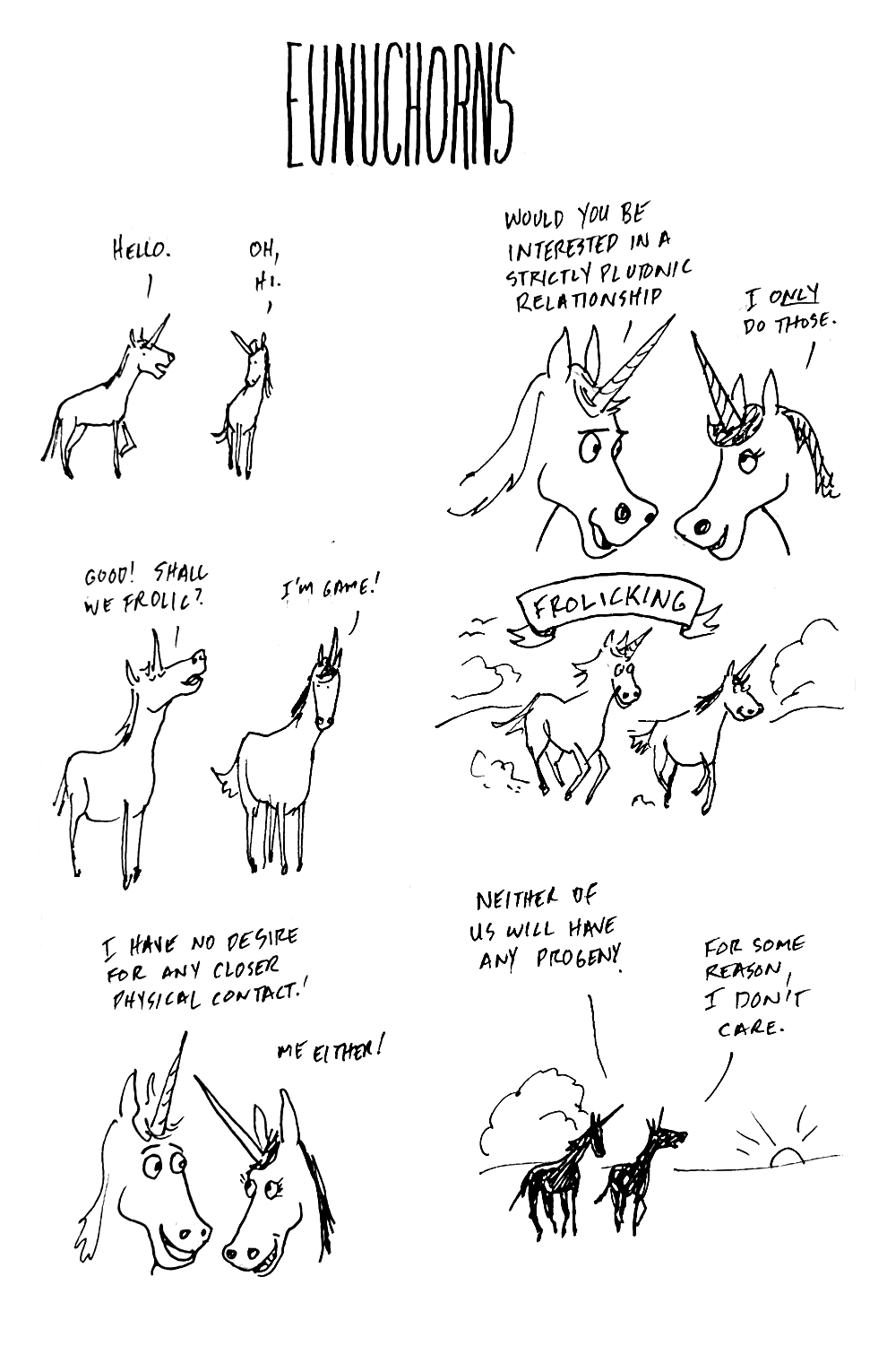 I’ll be honest, I don’t know much about unicorns. My sister Carrie made a joke about “Eunuch-corns” while we were talking on the phone and I told her I was going to use it for an Oddballs page… which I did, of course.