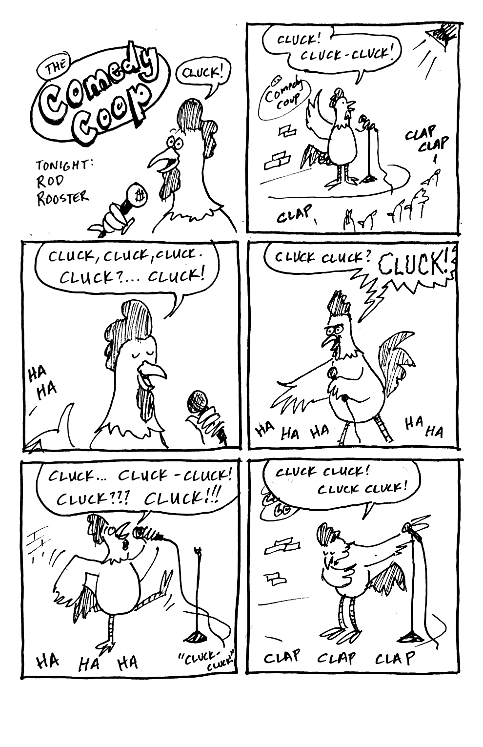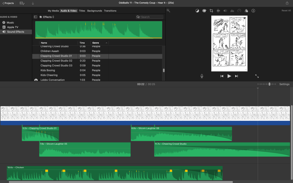 That said, it doesn’t do what I want it to do all the time. Take this comic: It wasn’t enough to simply have a narrator say, “Cluck, cluck!” and “Ha-ha!” Those are sounds, not words (i.e., onomatopoeia, as you may remember from grade school). I wanted a chicken sound and an audience laughter and applause. Enter iMovie!