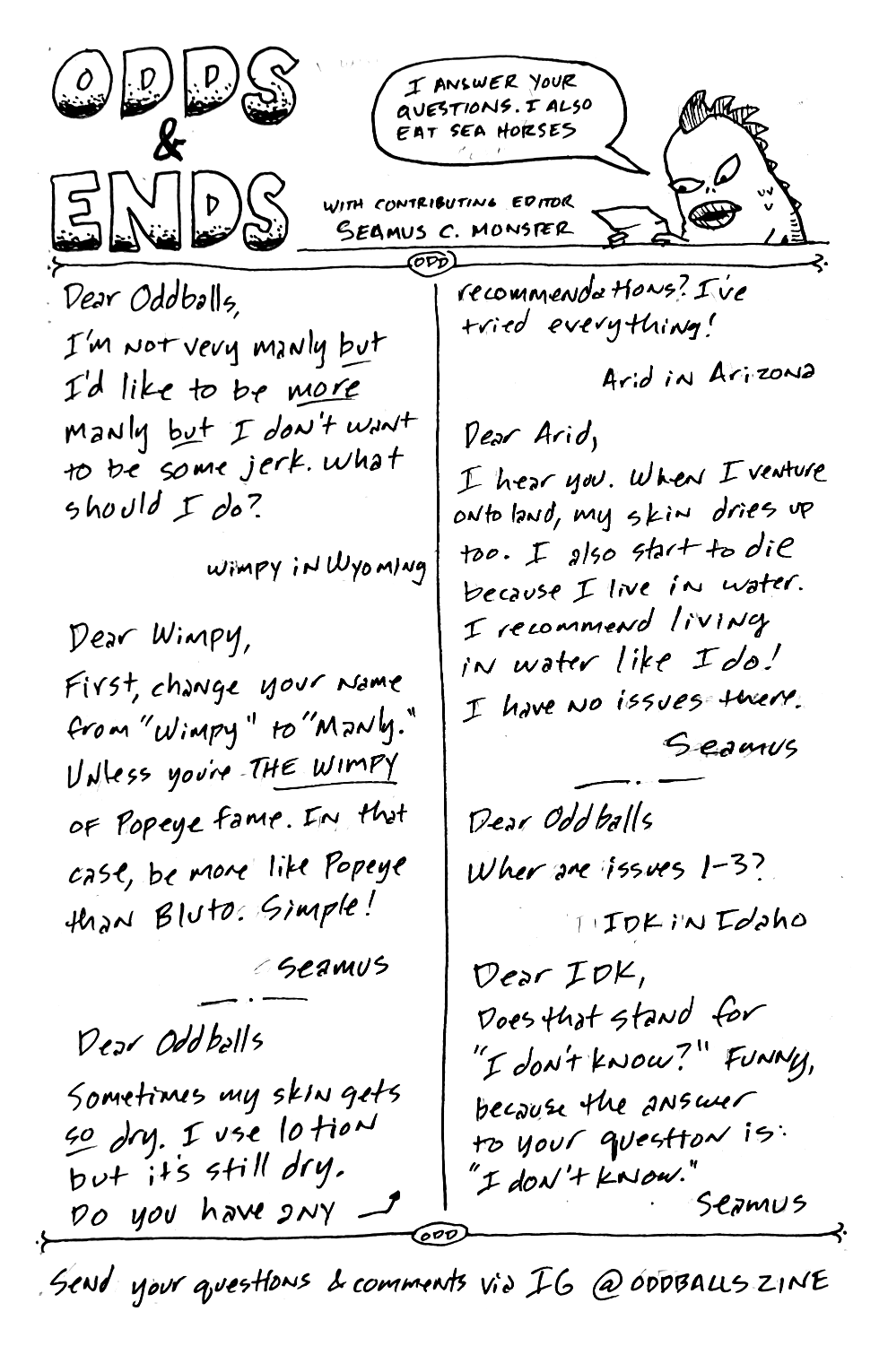 With contributing editor Seamus C. Monster – “I answer your questions. I also eat sea horses!”
