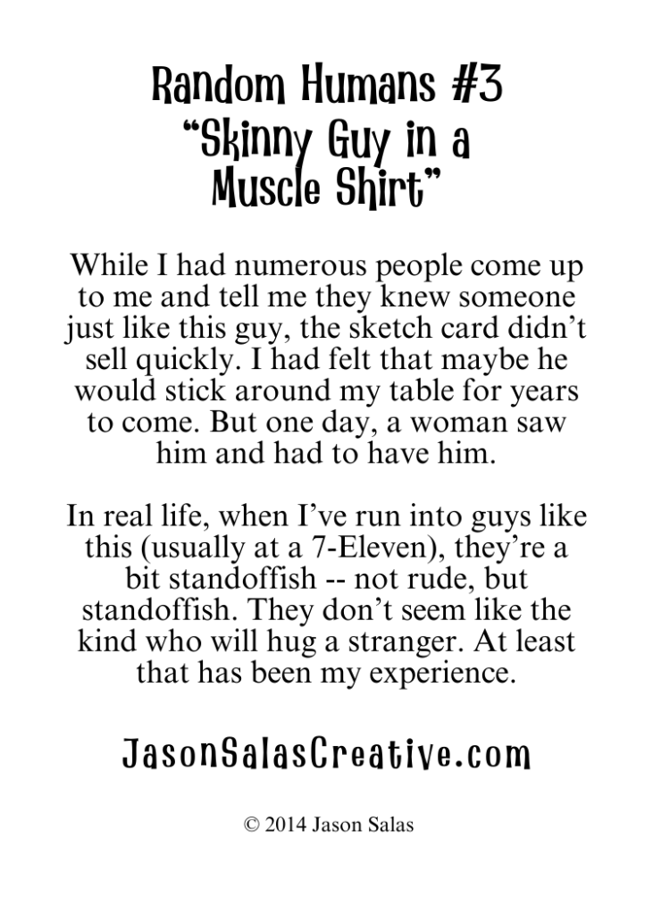While I had numerous people come up to me and tell me they knew someone just like this guy, the sketch card didn’t sell quickly. I had felt that maybe he would stick around my table for years to come. But one day, a woman saw him and had to have him.