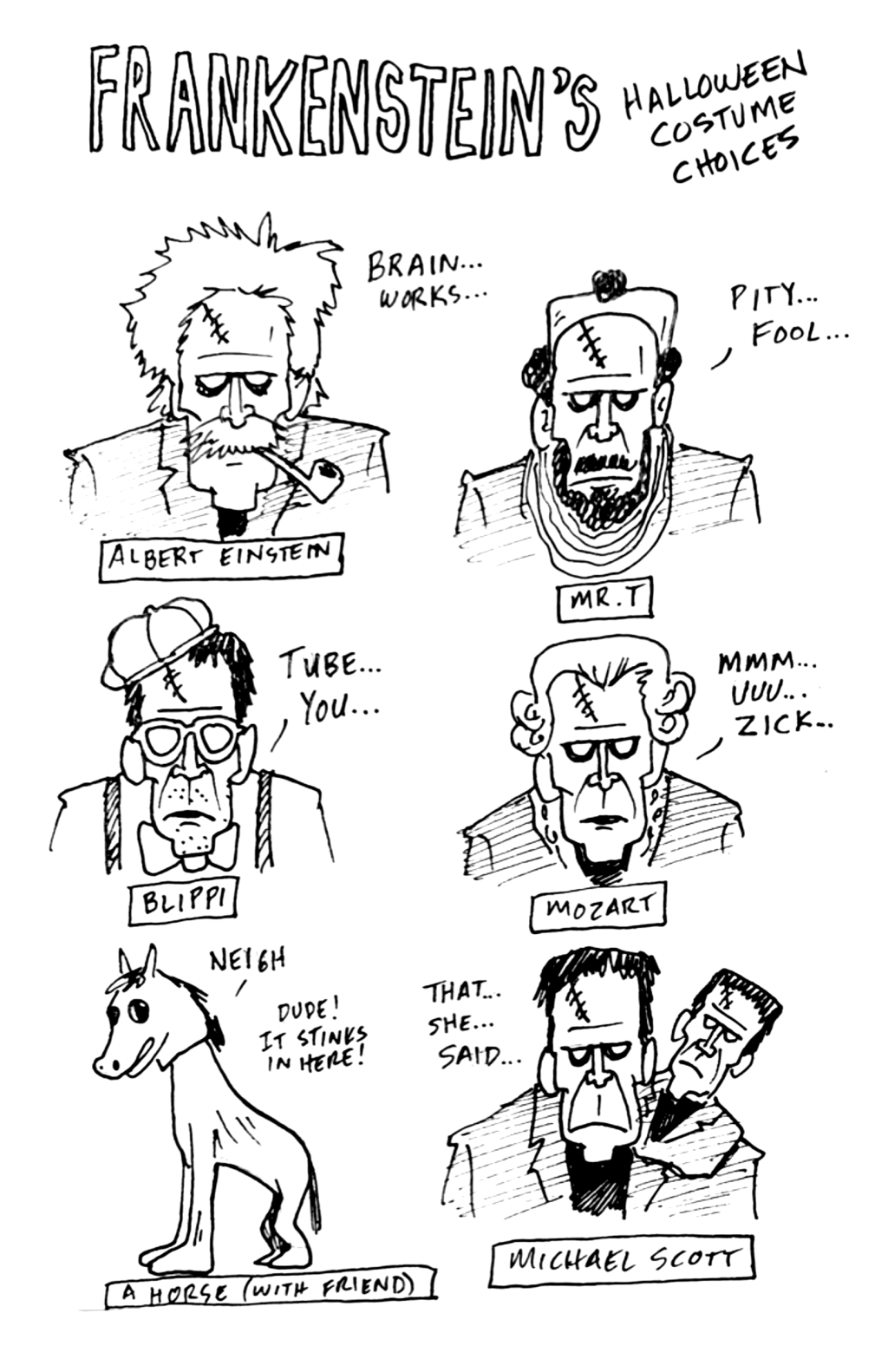 I just purchased a Frankenstein mask from Amazon just a couple of days ago. I figure that, if I get it early, I’ll be able to see if I can wear it with my glasses somehow. Most likely, they’ll have to be worn outside of the mask. The funny thing is I just made a comic about that scenario recently – see “Monsters with Glasses” from issue #9.