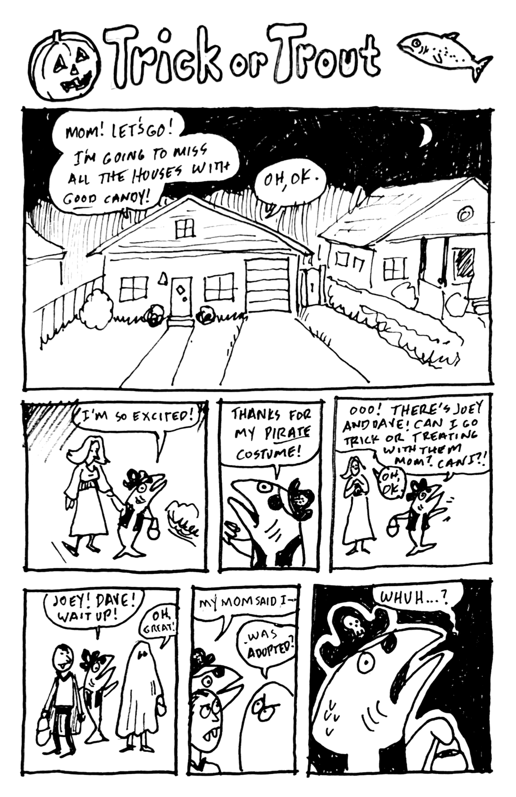 I made a small change to this comic before presenting it. In the last panel, I originally had a tear coming from the trout’s eye. Normally, small things like that don’t seem to make much of a difference. Then I thought about how Jessica and I talked about adopting and how we would want any adopted child to feel happy rather than sad when they found out – surprised, maybe, but not sad. I also thought of people I knew – relatives and friends – who have adopted or been adopted and it didn’t seem kosher to have the fish cry. Sure, the gag still works with him surprised, but I think he’d be happy, as any fish would be.