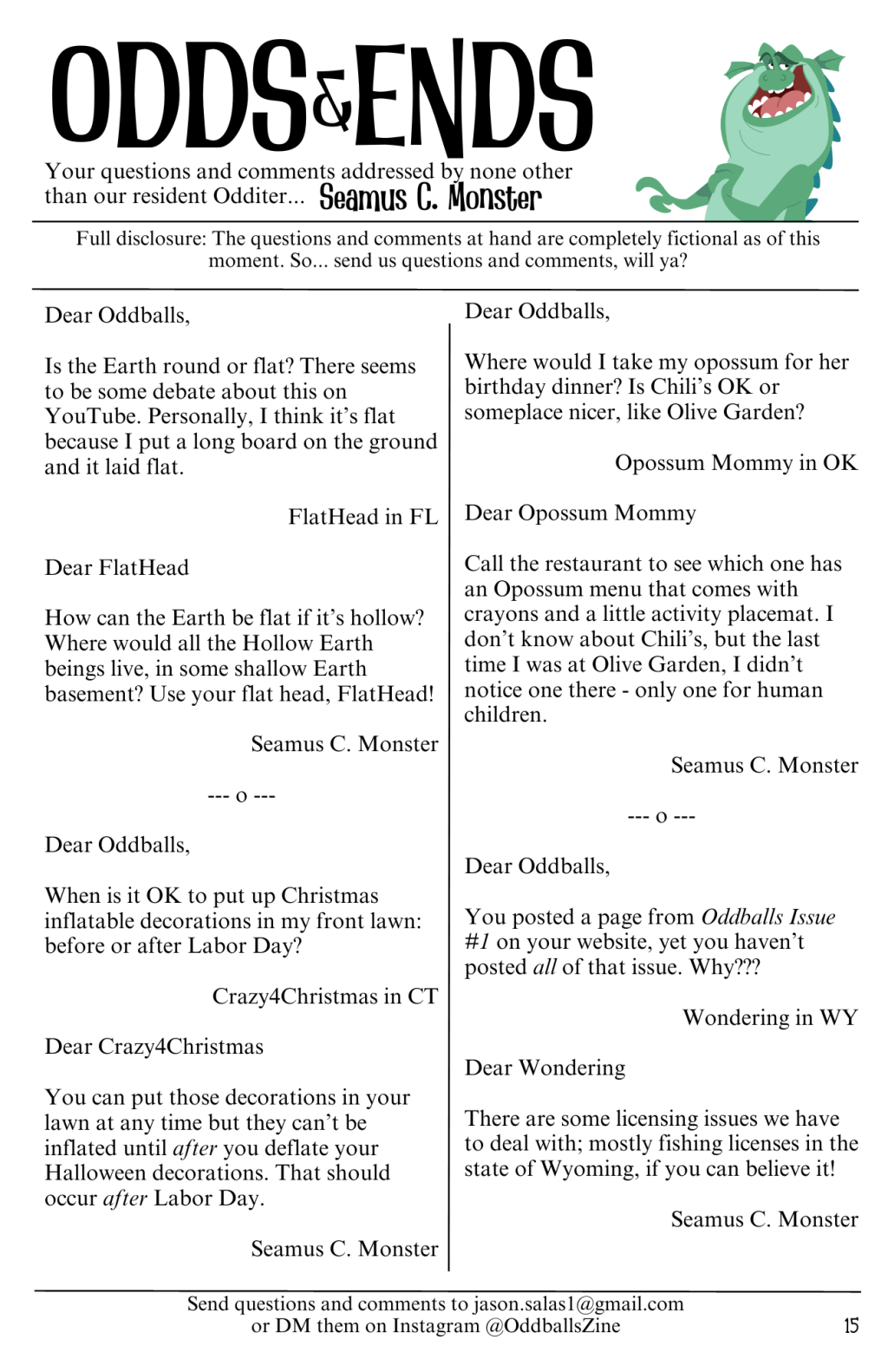 Your questions and comments were addressed by none other than our resident Odditer… Seamus C. Monster.