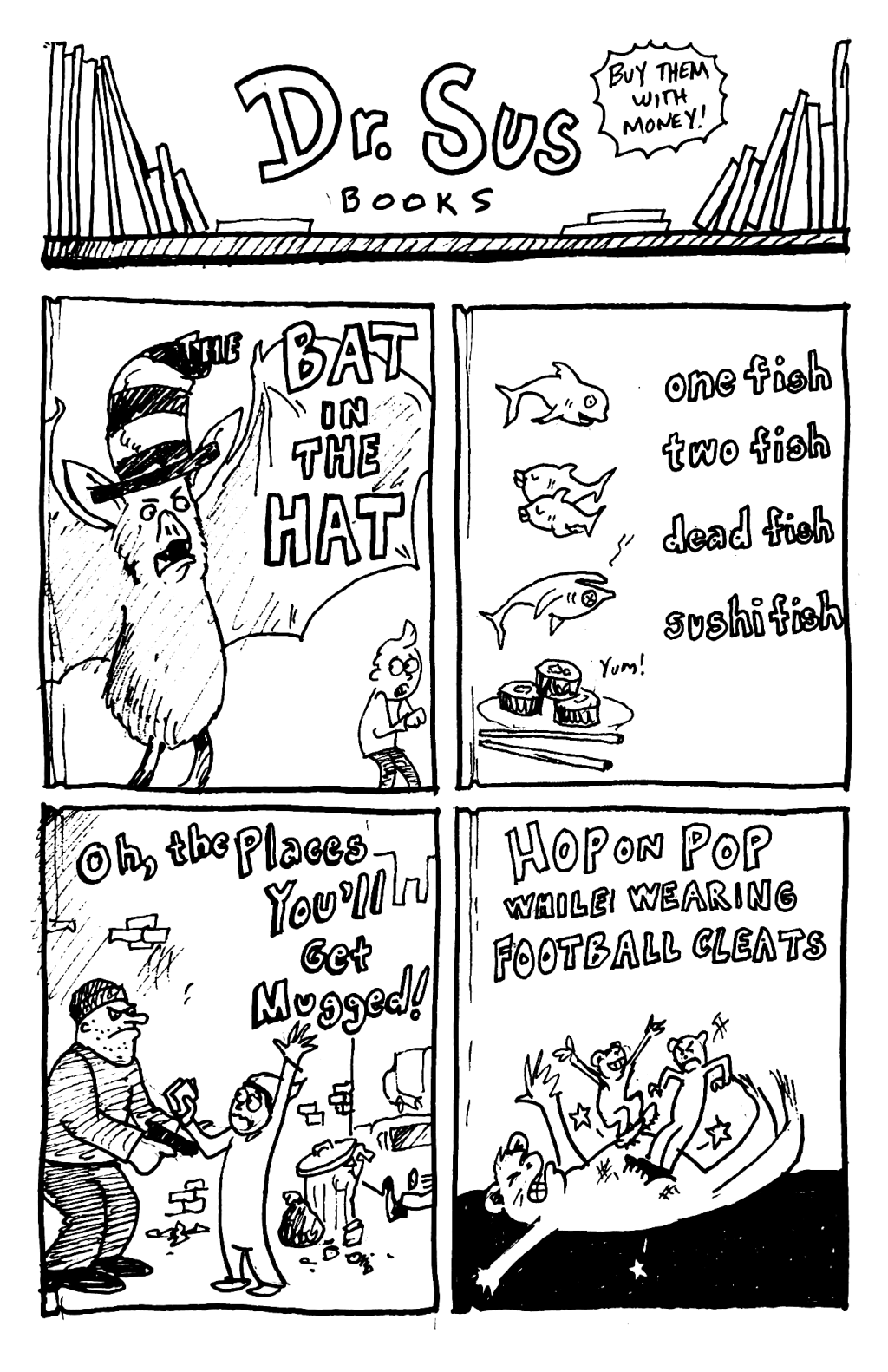 When I picked up the pencil to draw this, the first thing that came to mind was “Mocktor Seuss Books,” yet “mockter” isn’t a word, at least not that I’m aware of. So I put down the pencil. As soon as I did, the word “Sus” came to mind. Now, I’ve never used that term, but I’ve heard kids at the middle school use it. And so I drew.
