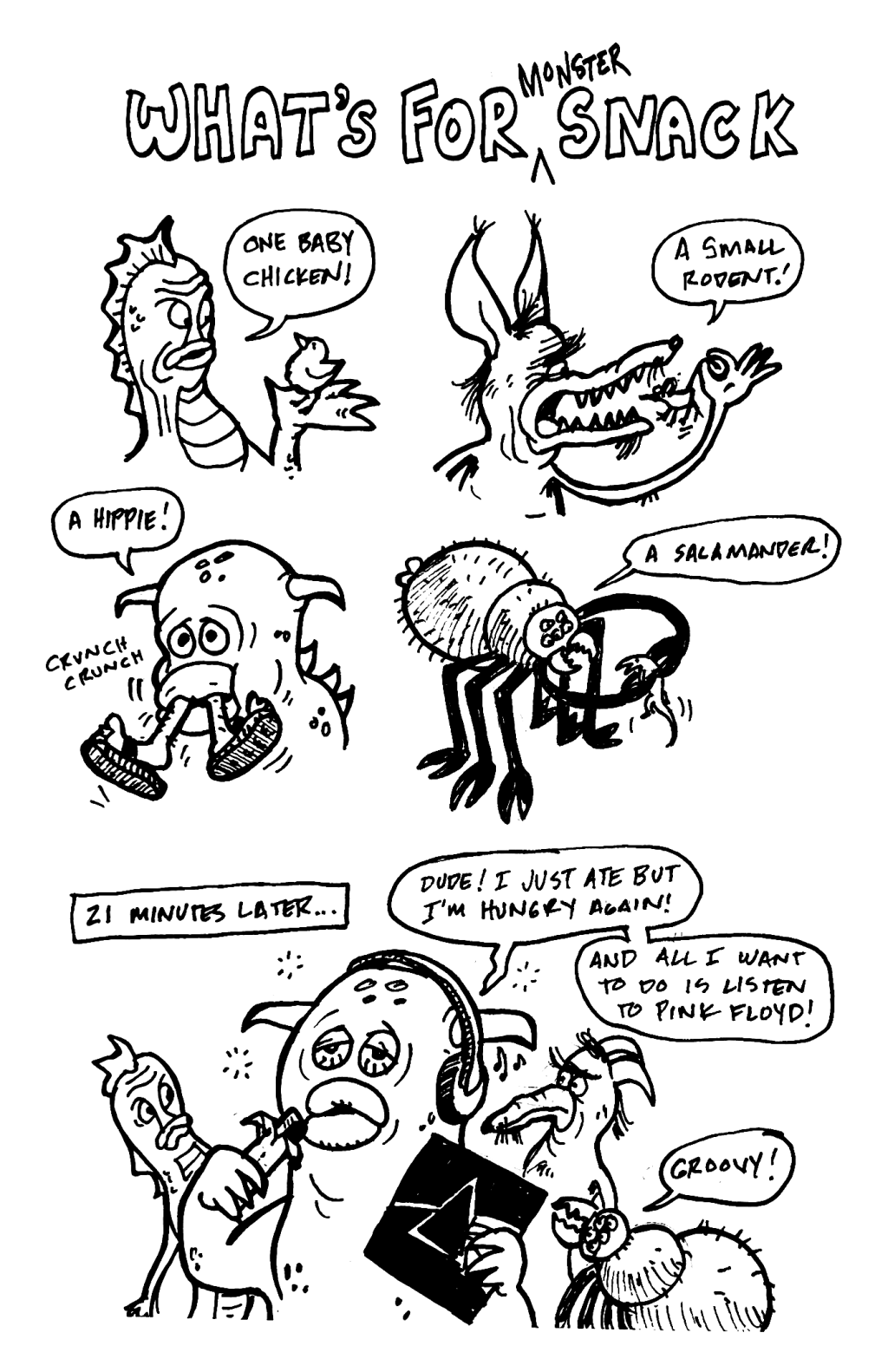 I liked how this one turned out. As I started it out, I had no gag in mind. I thought that it may be a series of six or seven monsters eating increasingly weird things. Then it hit me – monsters don’t really know about drugs yet, like us, whatever is in their food is in us once consumed. Food for thought.