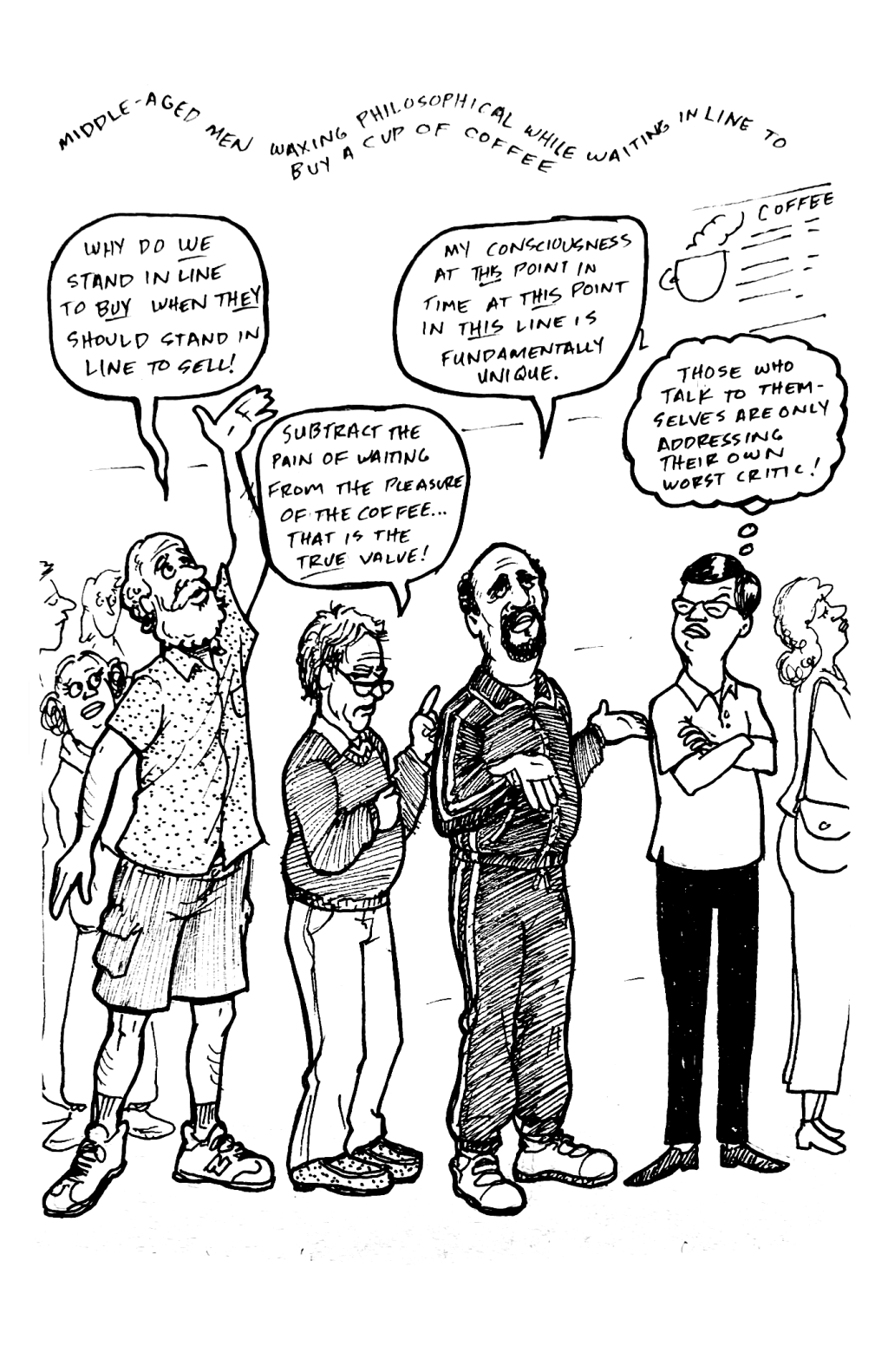 “Middle-Aged Men Waxing Philosophical While Waiting in Line to Buy a Cup of Coffee” From Oddballs #16 #oddballs #men #coffee #philosophy