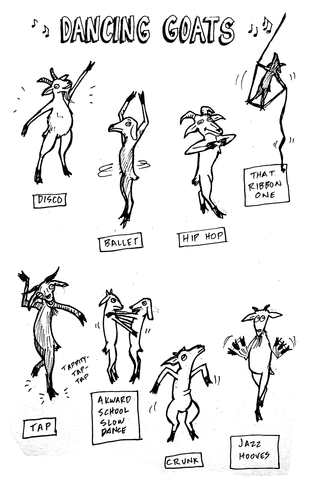 After drawing this comic, I asked myself, “Why on earth did I think of dancing goats? Where did that come from?”