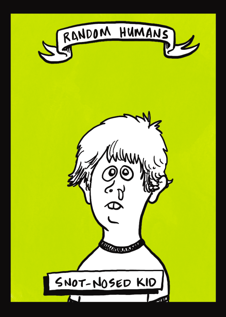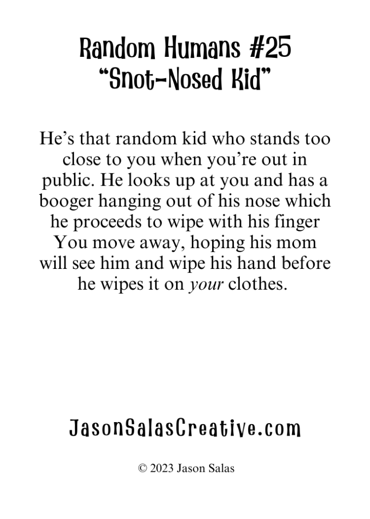 He’s that random kid who stands too close to you when you’re out in public. He looks up at you and has a booger hanging out of his nose which he proceeds to wipe with his finger You move away, hoping his mom will see him and wipe his hand before he wipes it on your clothes.