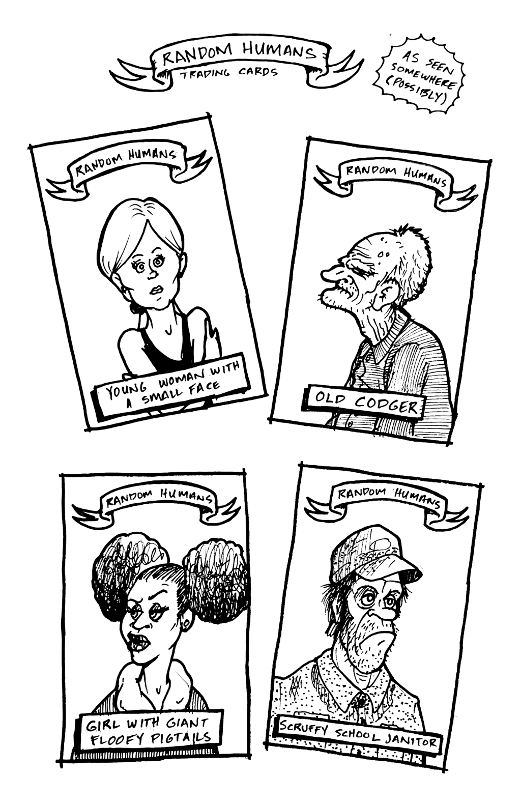 I’m including a page of Random Humans in each Oddballs zine. Why? Well, for one, because I want to, and two, it gives me fodder for posts in between Oddballs posts. Also, I’m in the process of printing up the Random Humans Trading Cards again. Maybe I’ll sell them in packs. Maybe I’ll give them away. Who knows? It’s all random right now.