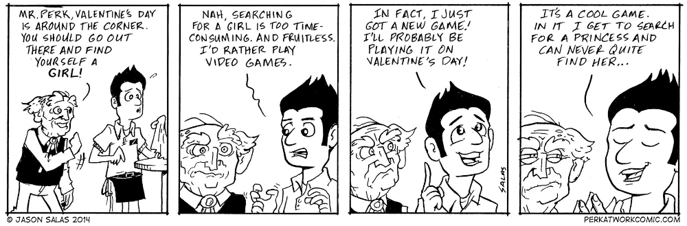 Here are some Valentine’s Day comics; a few from my strip Perk@Work and one from Oddballs. These go well with a cup of coffee and a box of chocolates. Enjoy!