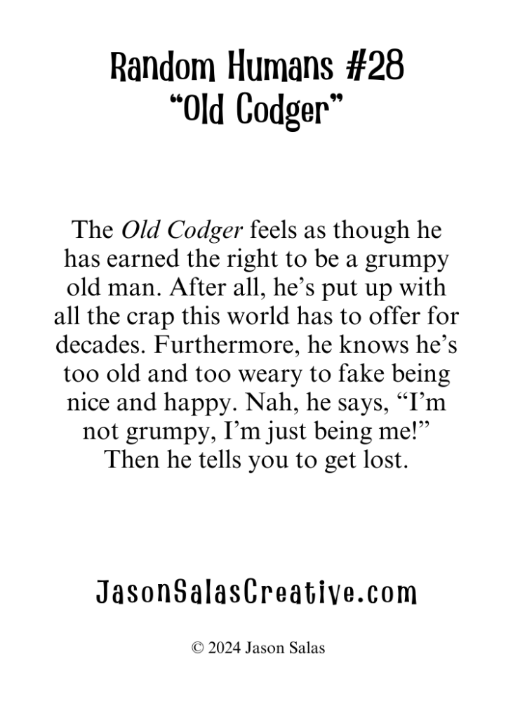 The Old Codger feels as though he has earned the right to be a grumpy old man. After all, he’s put up with all the crap this world has to offer for decades. Furthermore, he knows he’s too old and too weary to fake being nice and happy. Nah, he says, “I’m not grumpy, I’m just being me!” Then he tells you to get lost.