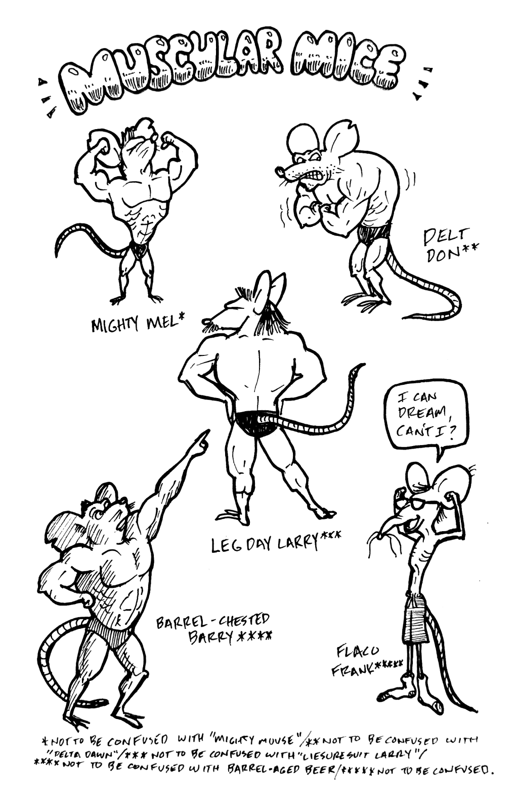 I never know which pieces will resonate with you and my other readers. I started pencilling this piece while Jessica and I were upgrading our old iPhones for new ones at AT&T. There was no gag other than mice with muscles. While inking, I came up with the footnotes.