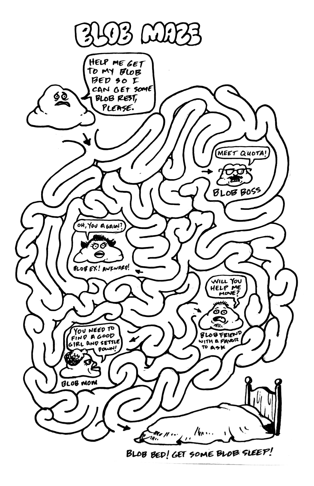 I enjoy making these mazes. This one was fun since it felt like I was drawing intestines. Drawing things like that is a bit easier because there are no straight lines – it’s all gooey curves. Also, if you’re drawing anything that is not aesthetically appealing in the first place, you can embellish the grossness of it. That’s always a blast!