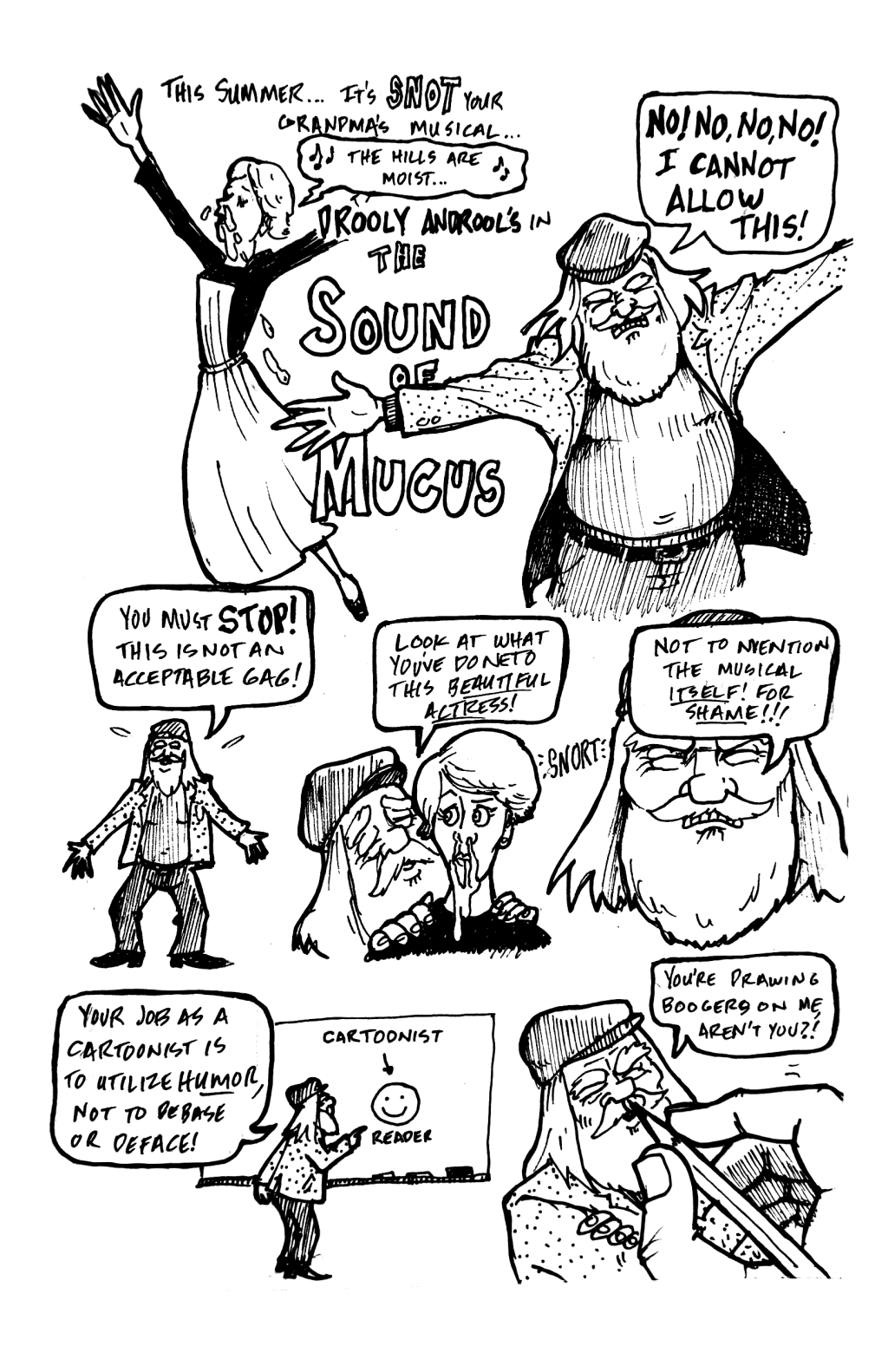 I enjoy drawing this bearded guy. In my mind, he’s a literature professor who can’t stand to see bad satire, especially if it mocks the source material, even if it’s funny. If it’s not funny, that makes it all the worse.