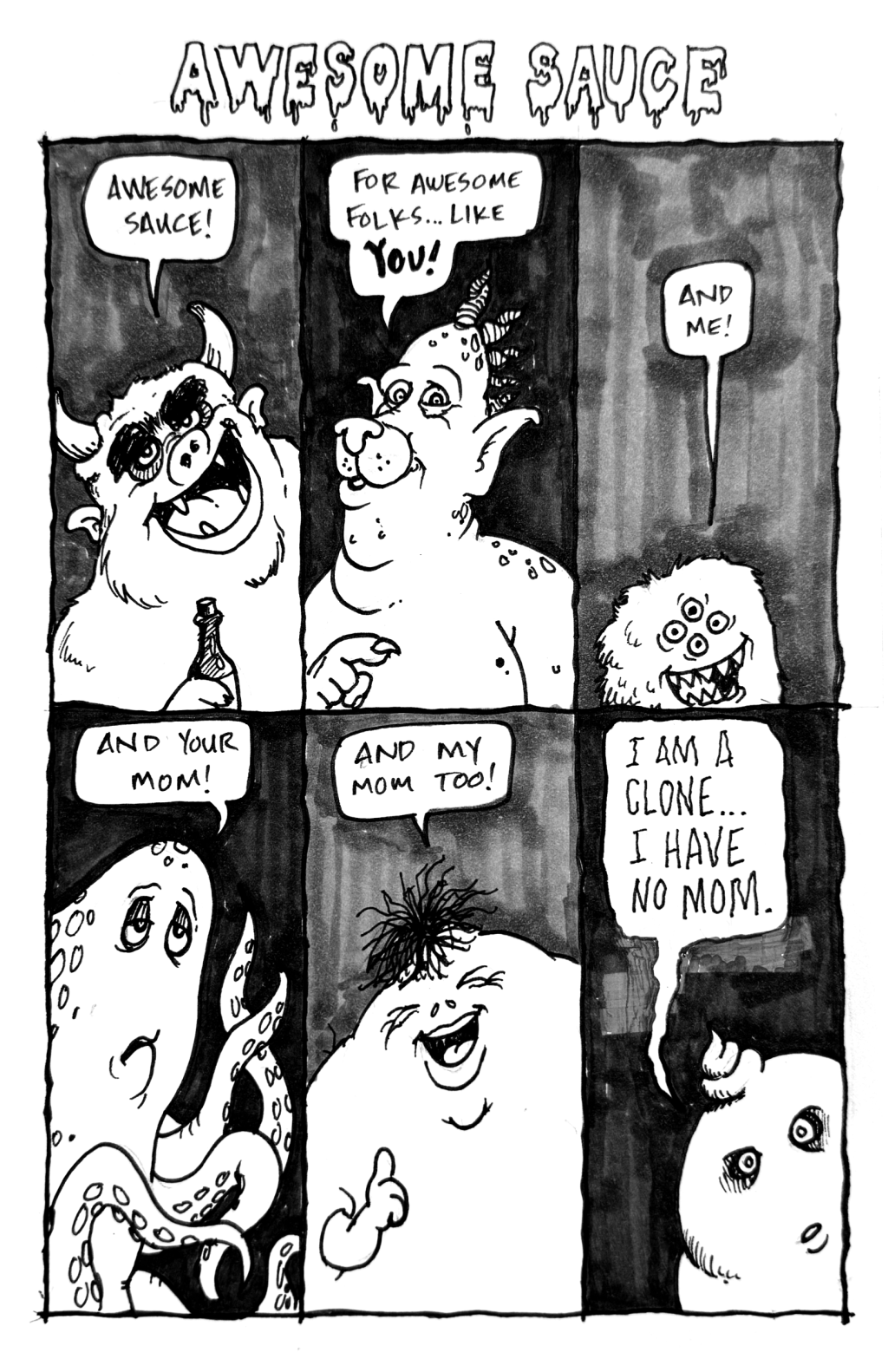 In this comic, I simply started with the premise of “Awesome Sauce.” I didn’t know if it was going to be about food or ability or whatever. The only thing I started with was six long boxes that I thought might look good presented on a phone screen. Without any hesitation, I started drawing some monsters; those are easy. The clone at the end just oozed out of my brain. Not sure how I feel about that.