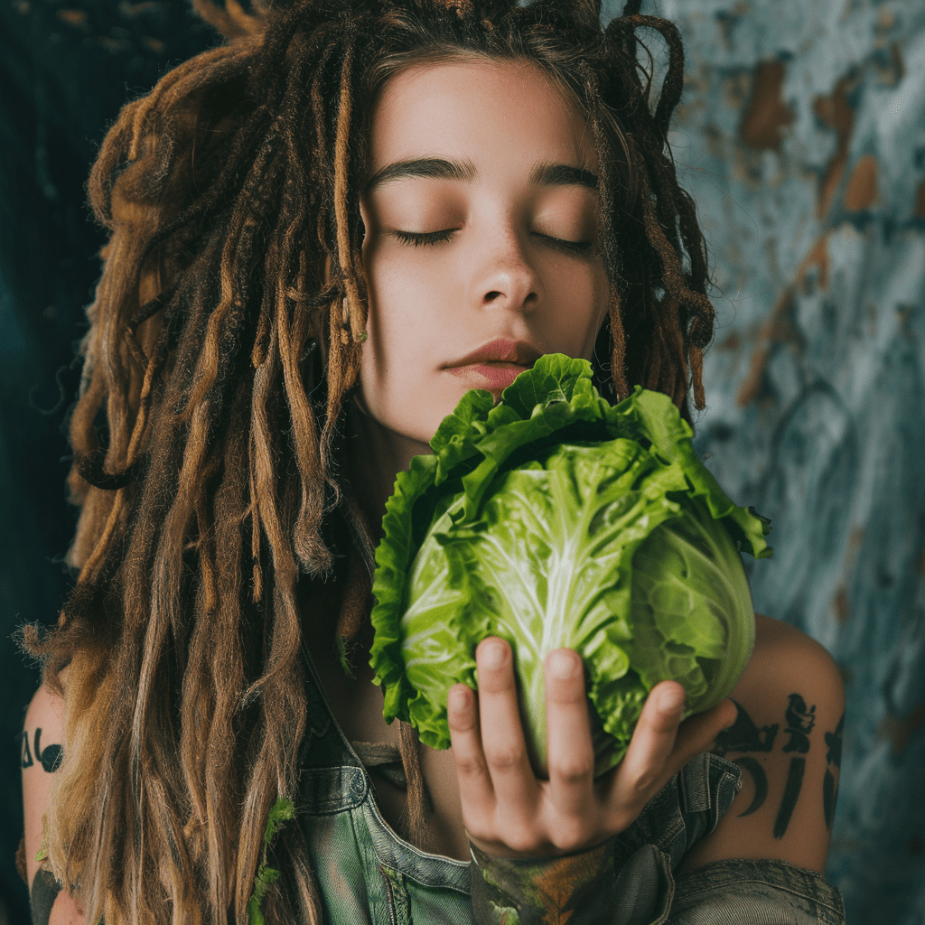 Autumn T. of Missoula, MT felt that our Crunch Vegan Lady with Dreadlocks (Iss. #19) was missing something… a vegetable! Here she is with her favorite meal: a head of lettuce. Good for you, Autumn. Now, excuse me while I go get a burger.