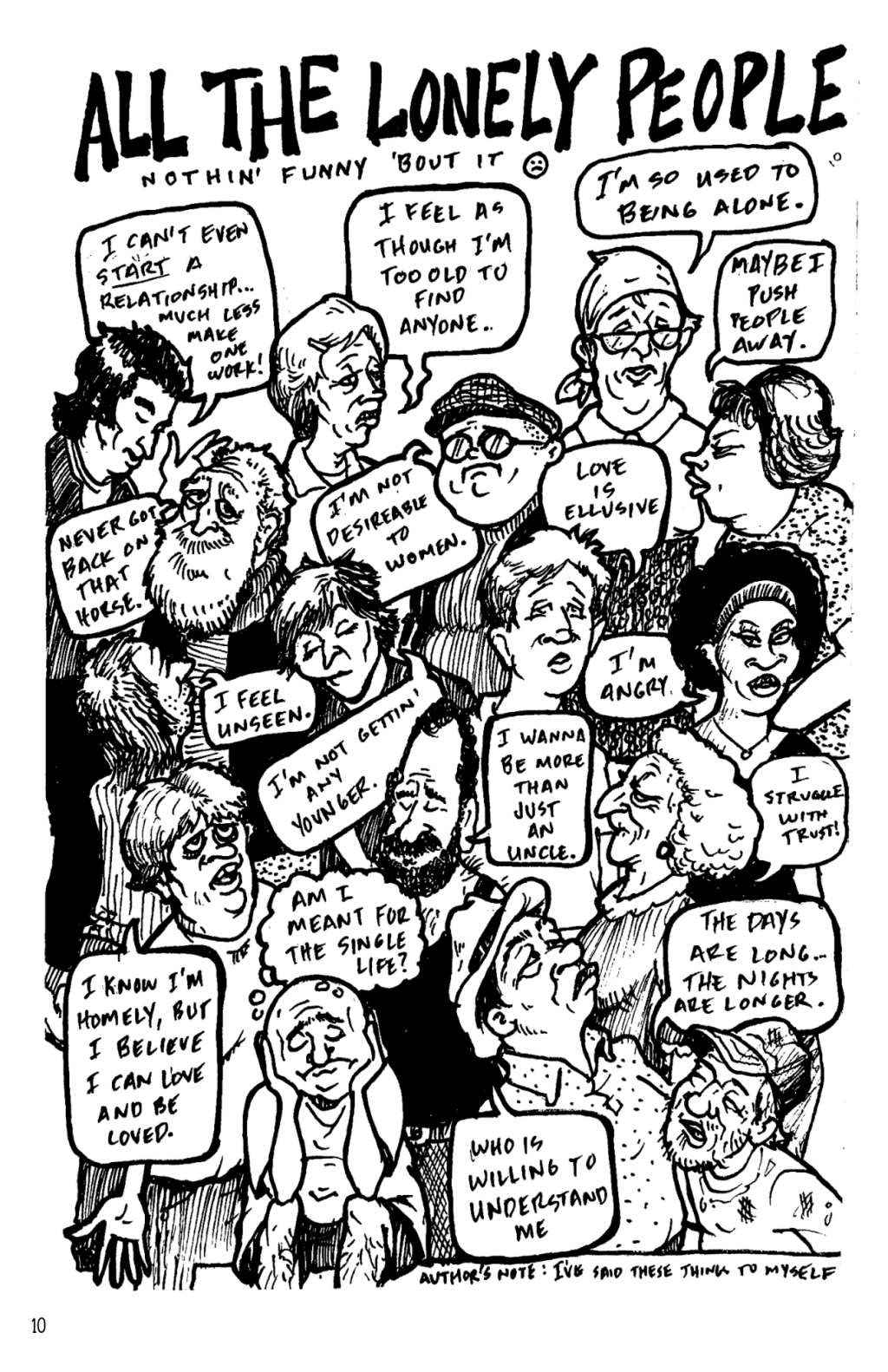 This begs the question: What is humor? To me, it’s not so much comedy (although, that can be an element of it), but more a connection at the totally human level that can have a funny “edge” to it. In this case, it’s humorous how so many people can feel lonely for different reasons yet those reasons overlap inside of themselves and with others. How can we be in a club where we all share the same views and not have a community? That’s the proverbial Lonely Hearts Club.