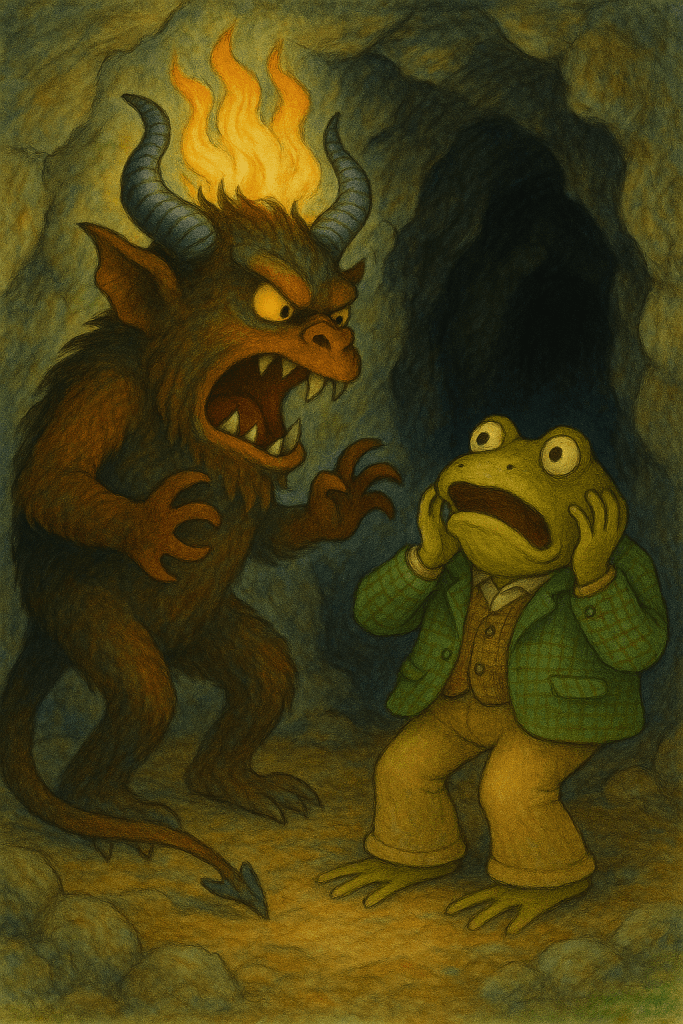 The key for this parody is to make it funny without mockery. At the same time, the names have to be similar enough so that the you can instantly know it’s a parody of a specific book. Few nouns/names rhyme with “frog” and/or “toad,” and even fewer nouns/names are humorous. I thought the Balrog was a good choice in that it’s demonic nature is the opposite of either Frog’s or Toad’s. That type of dychotomy lends itself to humor. On a similar note, I could have gone with Frog and Frodo, but that doesn’t ring as well and there’s no conflict. Frodo would probably have a fine time with Frog. Sure, it doesn’t have to be an LOTR character, but tell me some other character names that rhyme with “frog” and/or “toad.” I’ll wait.